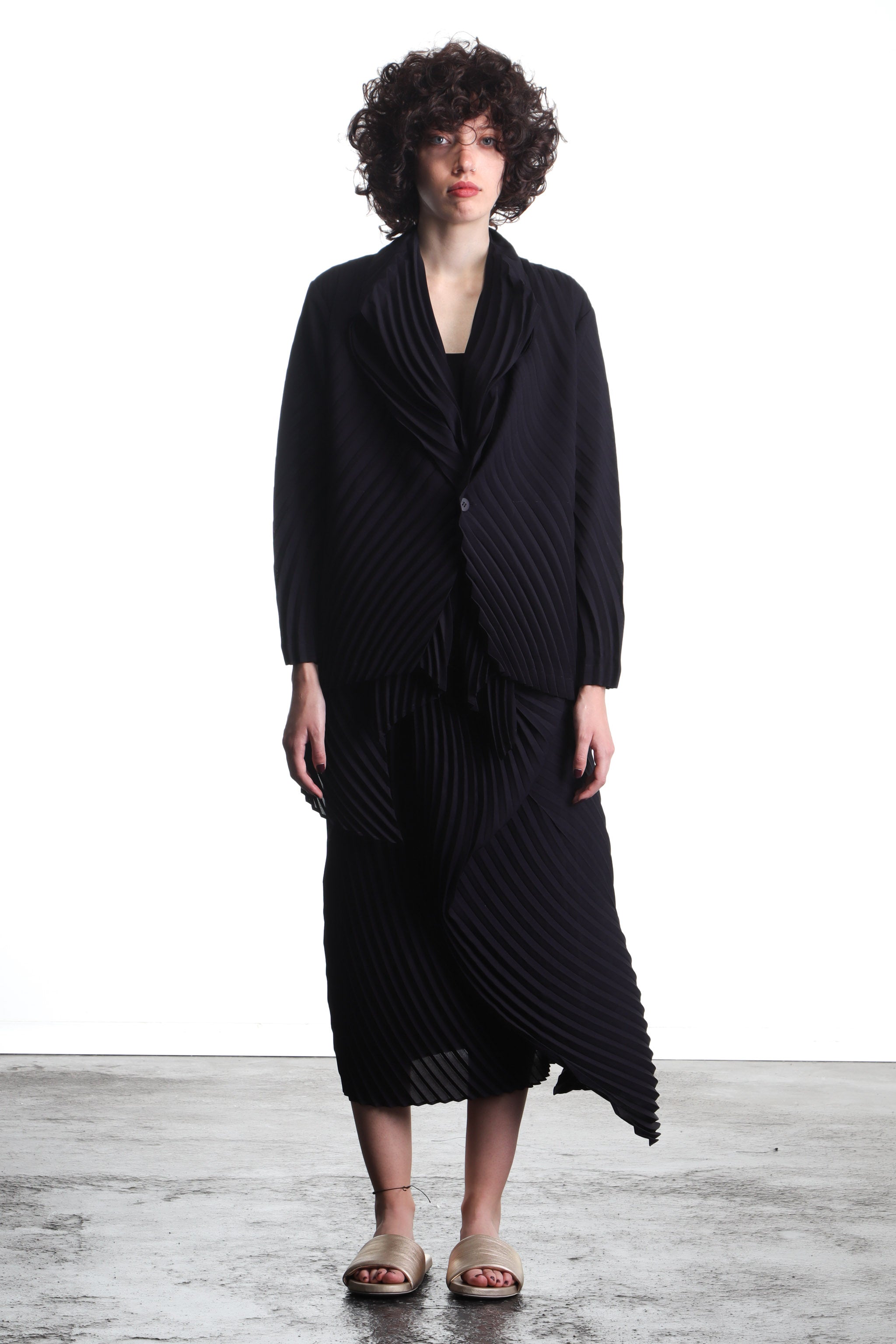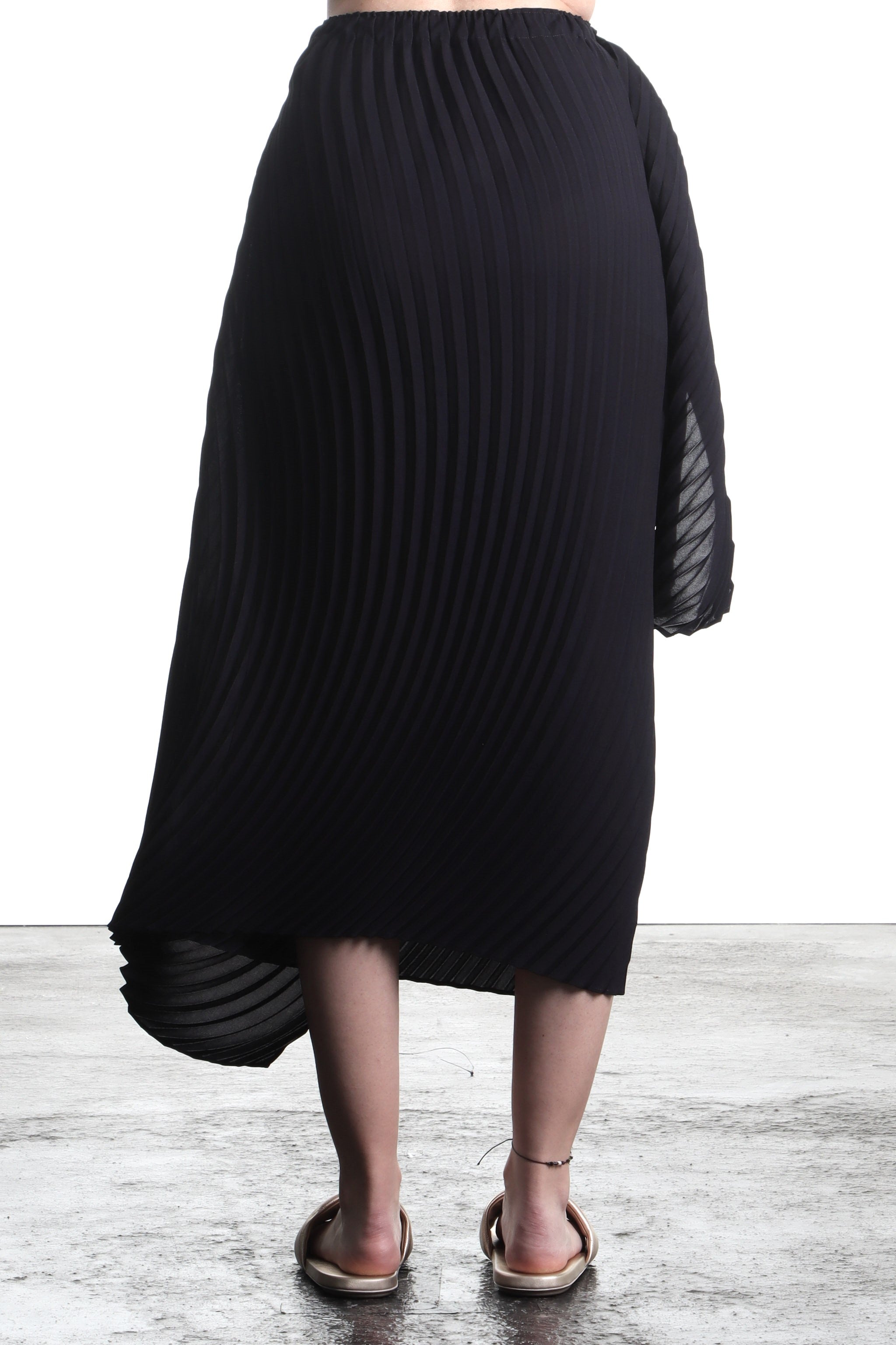 This black, asymmetric midi skirt by Issey Miyake is an avant-garde masterpiece. The pleated and wrap look makes it particularly dynamic and gives every wearer an individual and eye-catching look. The perfect garment for modern and bold women.