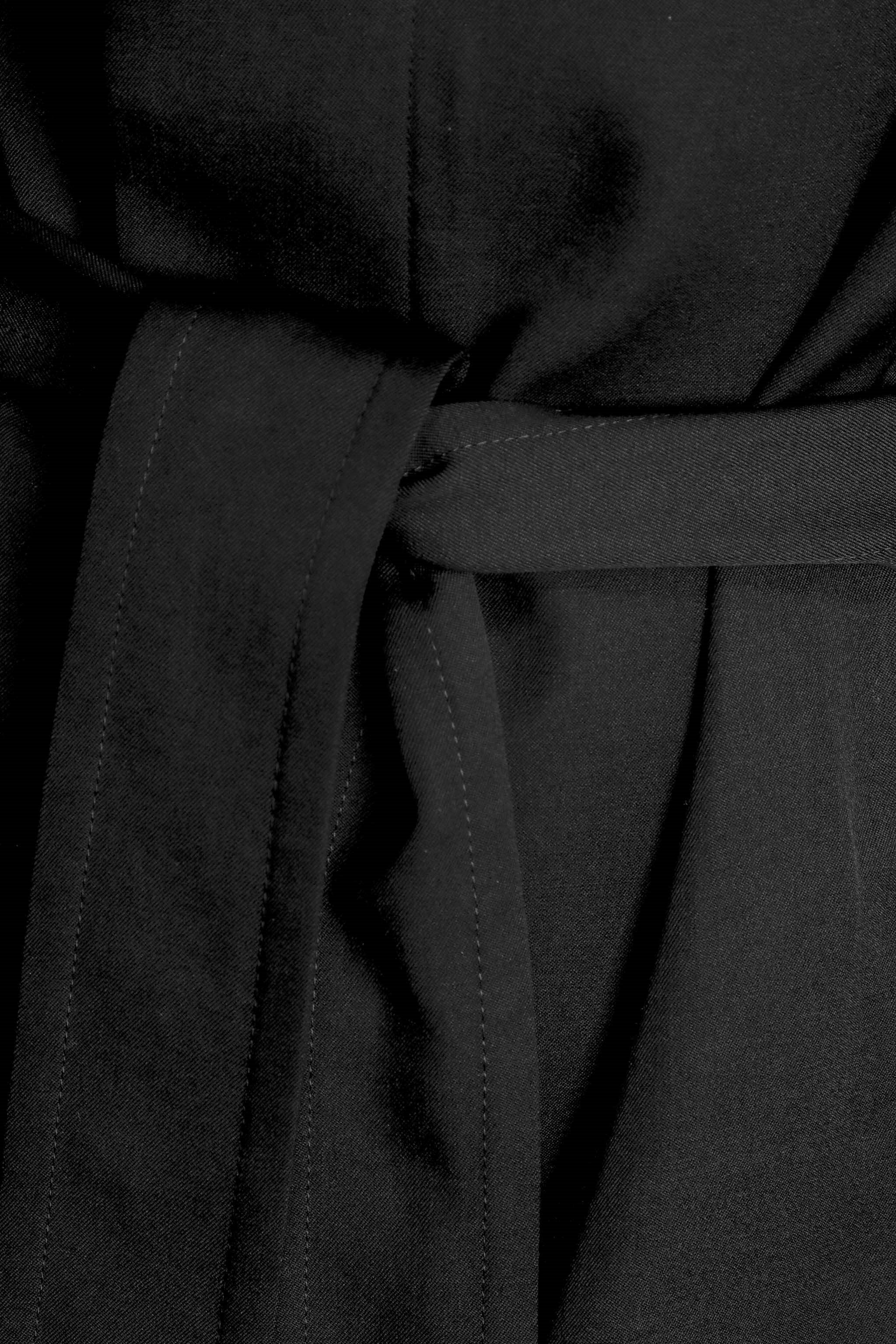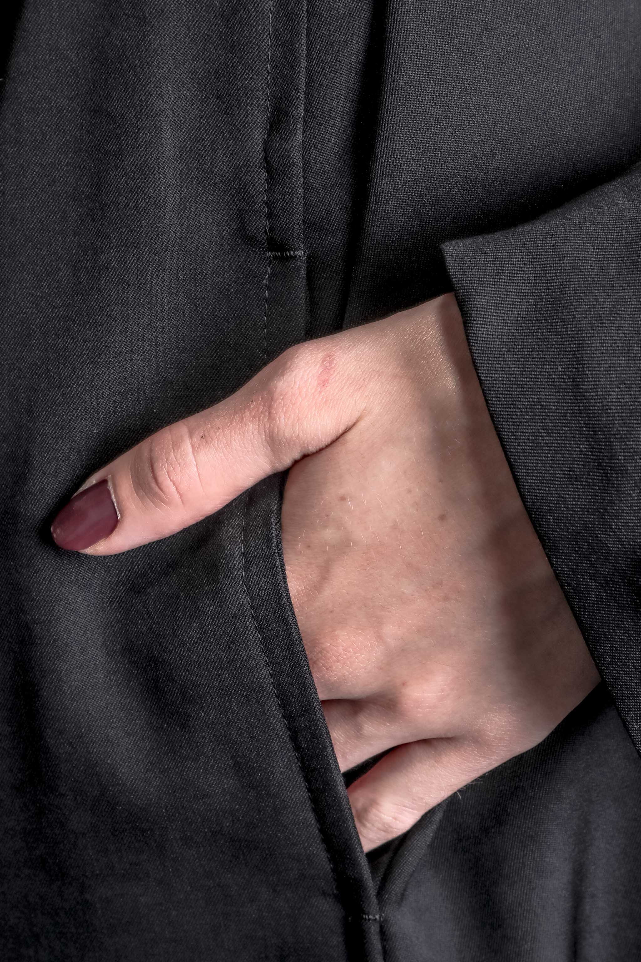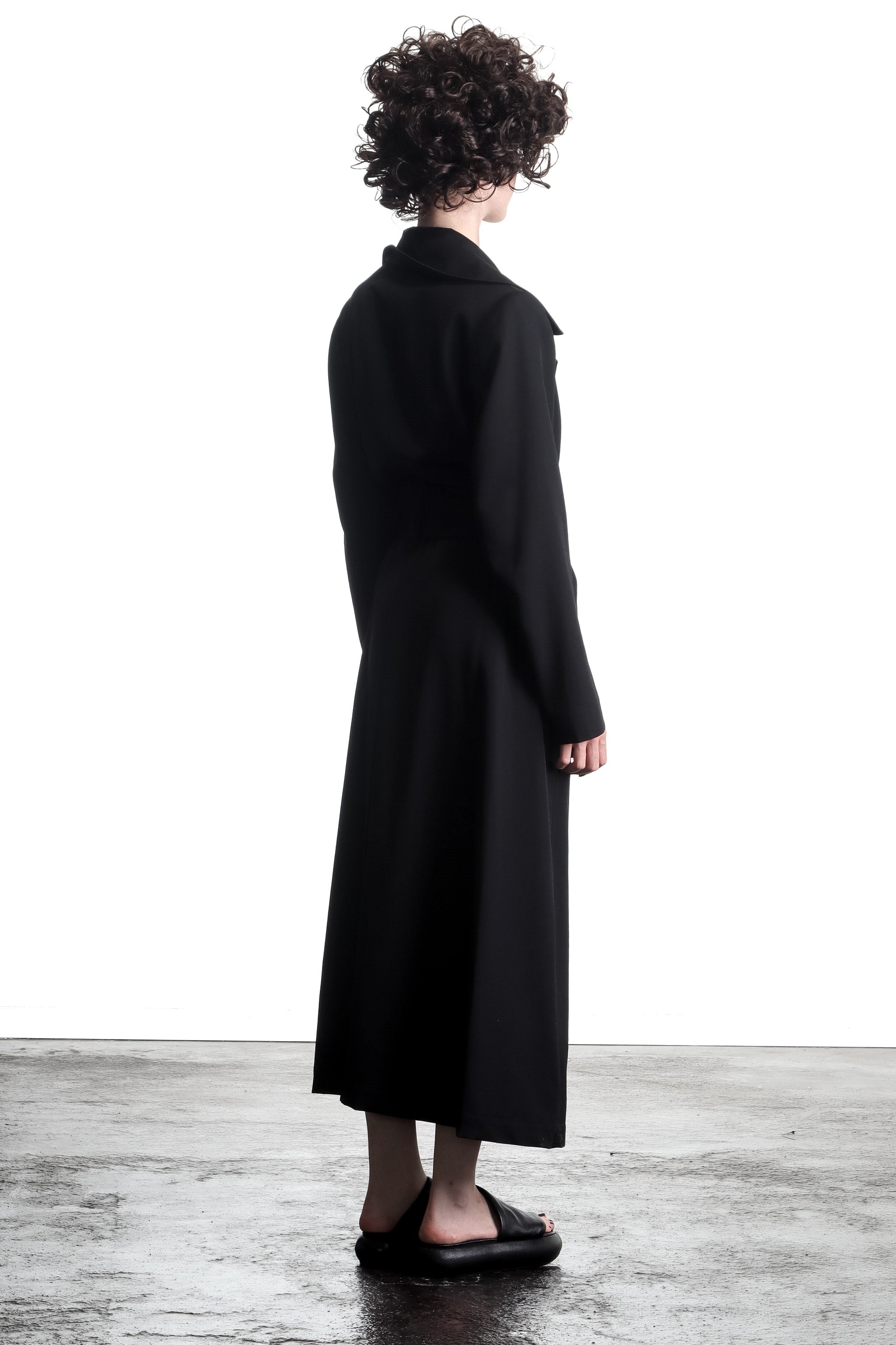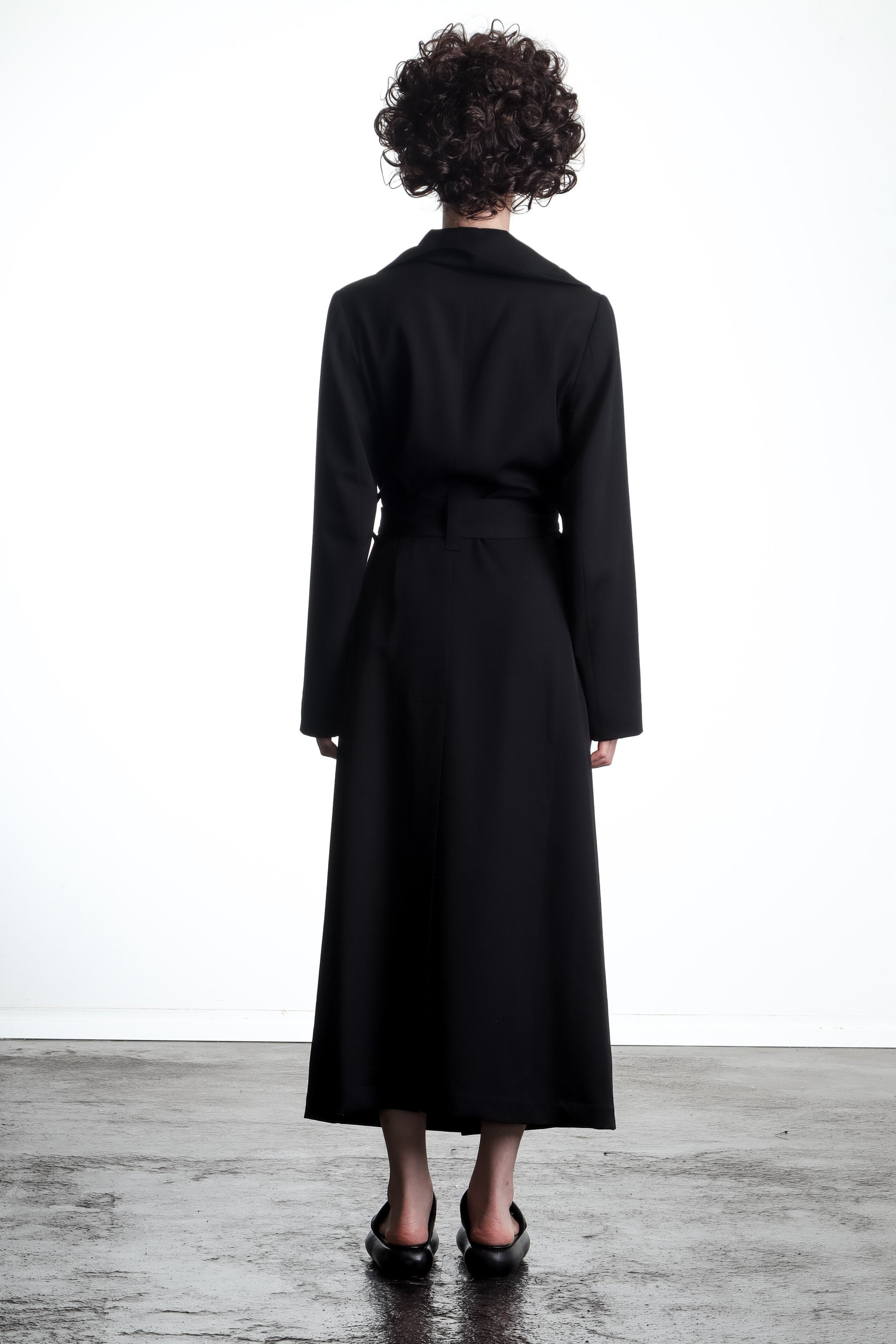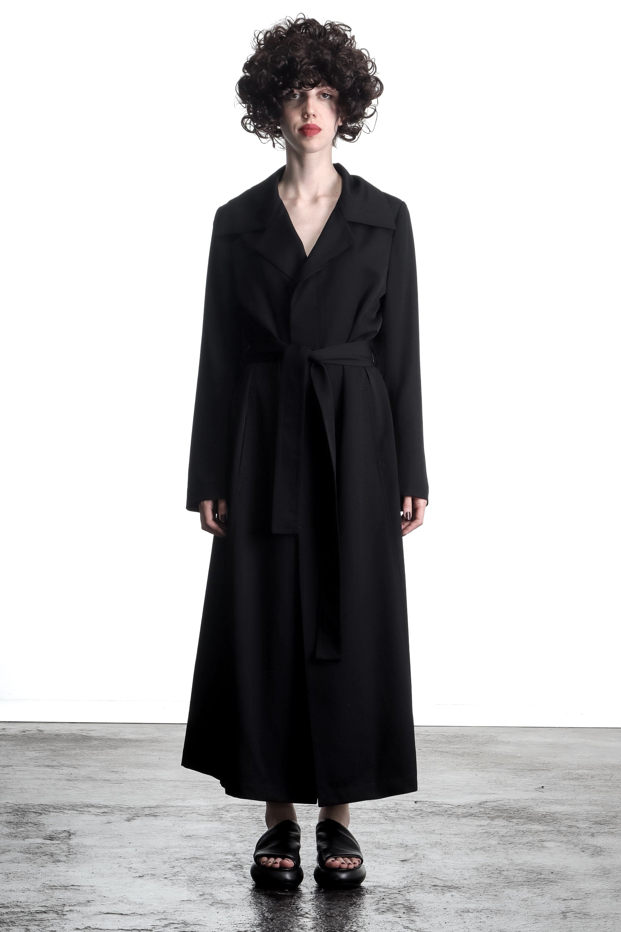This Yohji Yamamoto coat has a casual, clean design and an impressive length. The included belt emphasizes the waist and gives the coat an elegant touch. Perfect for a confident and stylish look.