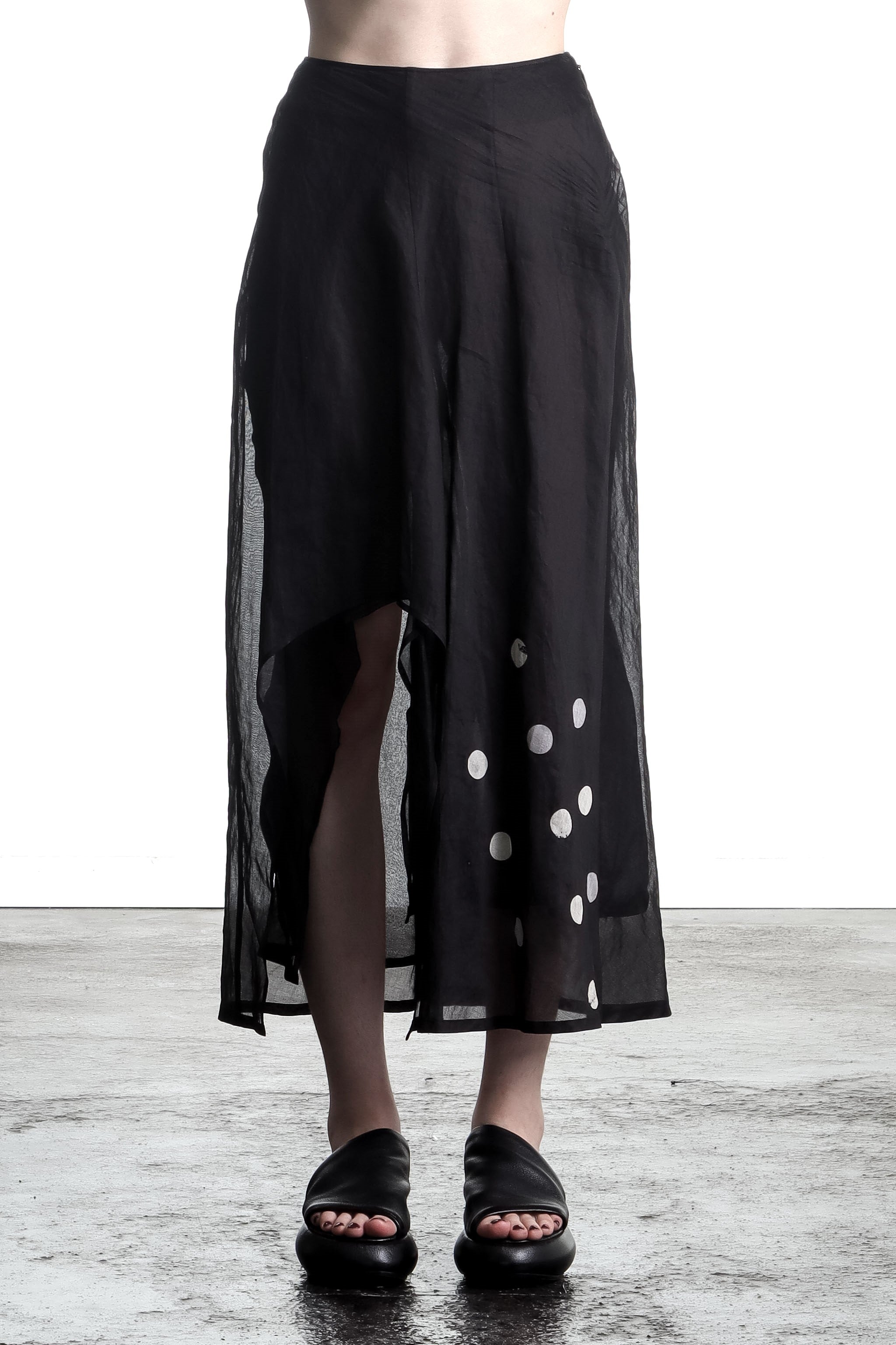 This Yohji Yamamoto skirt features a semi-sheer polka dot print and an elegant maxi length. The perfect companion for special occasions, it is both playful and stylish. Enjoy the sophisticated look of this skirt and feel confident and elegant.