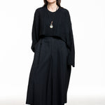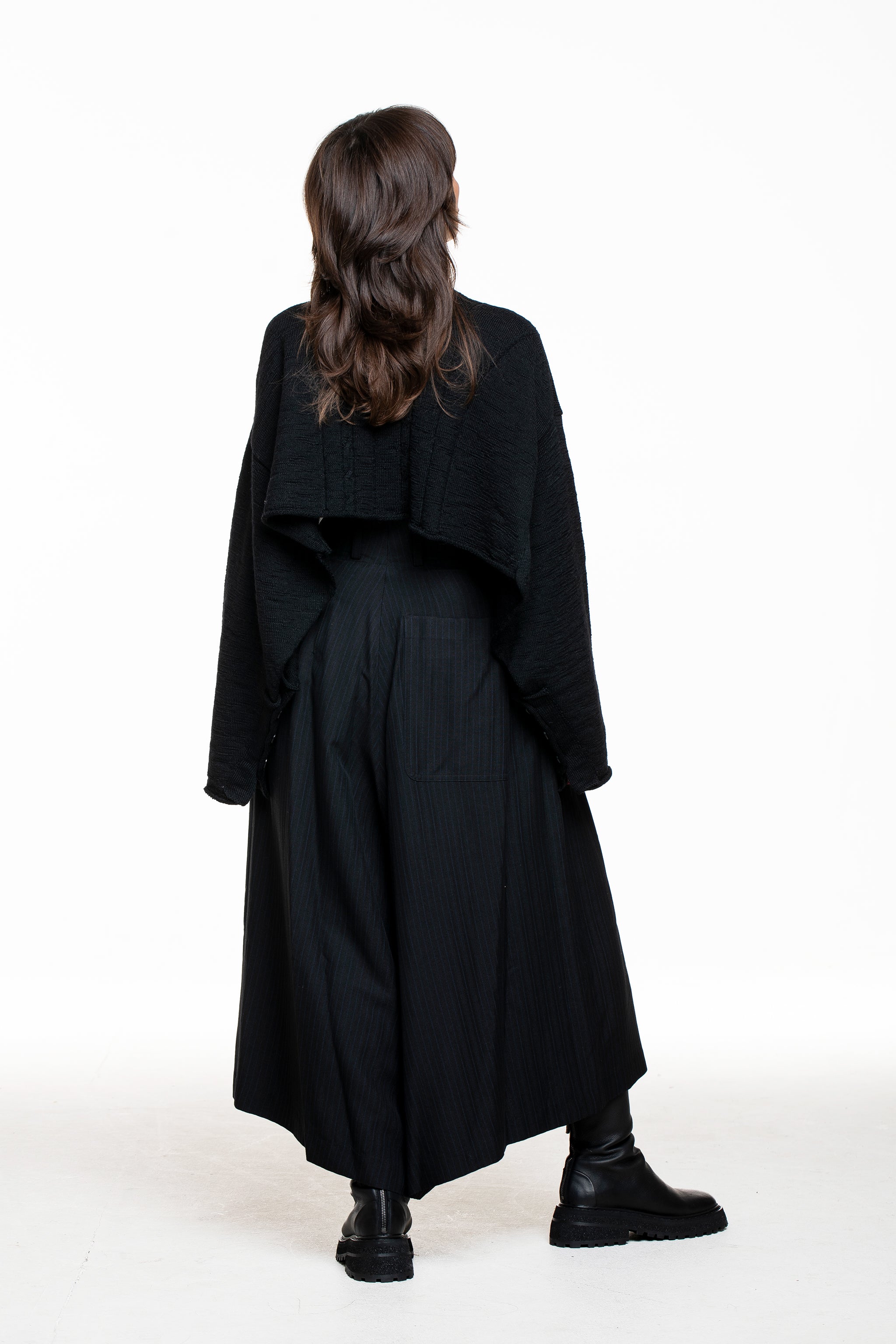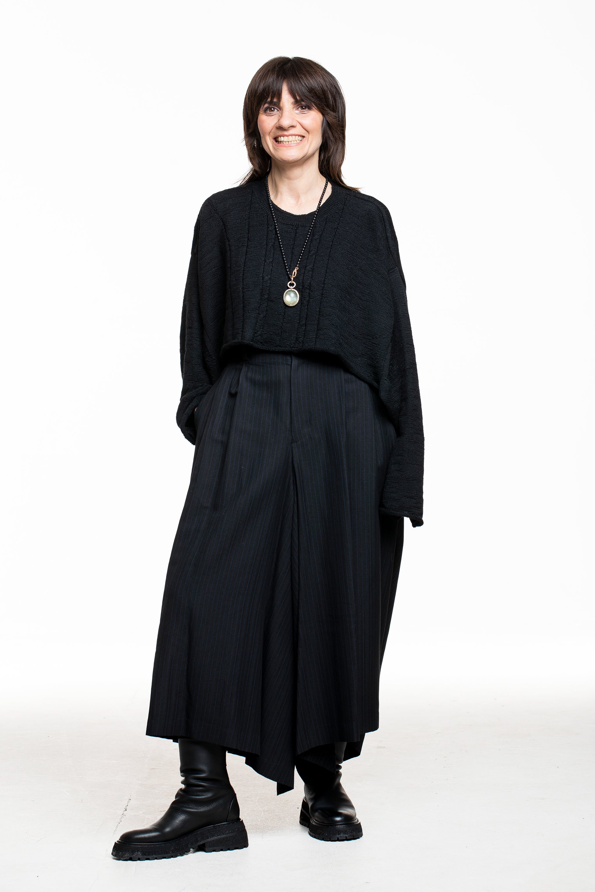 Sculptural culottes by Y's Yohji Yamamoto, combining masculine tailoring with iconic Japanese avant-garde. The wide, calf-length cut with overlapping front sections is reminiscent of a deconstructed suit skirt, while the fine pinstripes lend the style an almost graphic severity. At the back, a generous pocket construction adds casual workwear notes - perfect with a compact knit and chunky boots for a radically modern but wearable signature look.