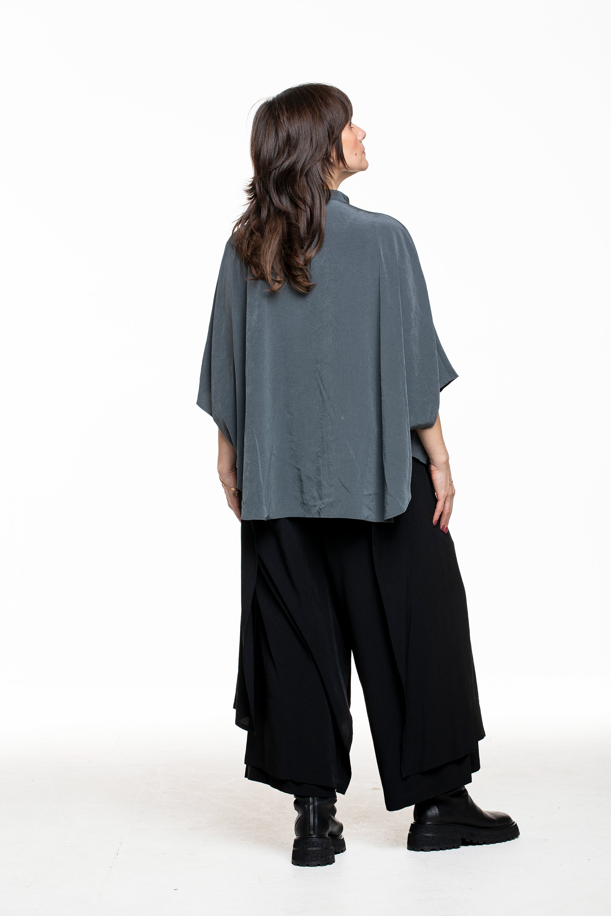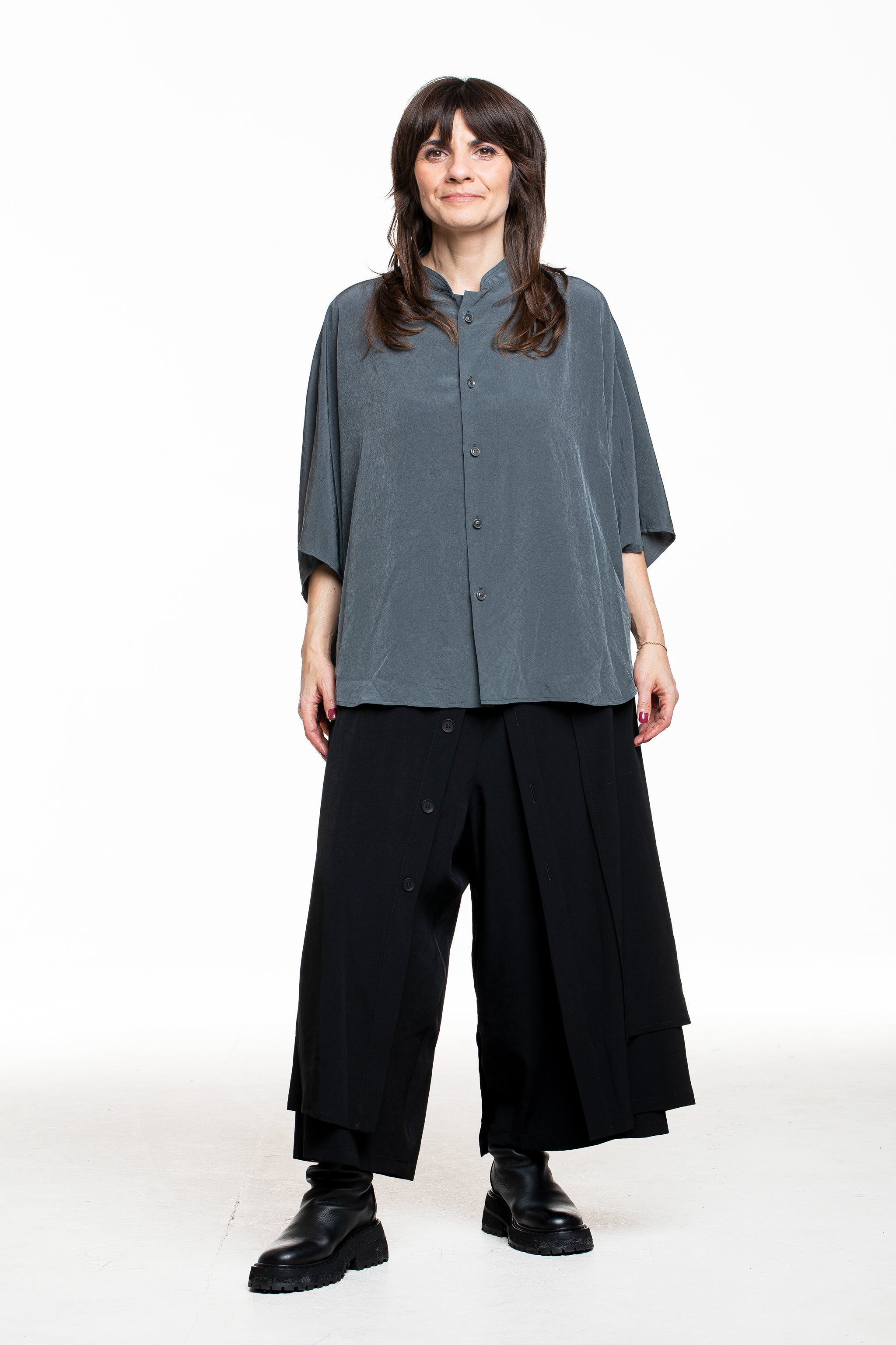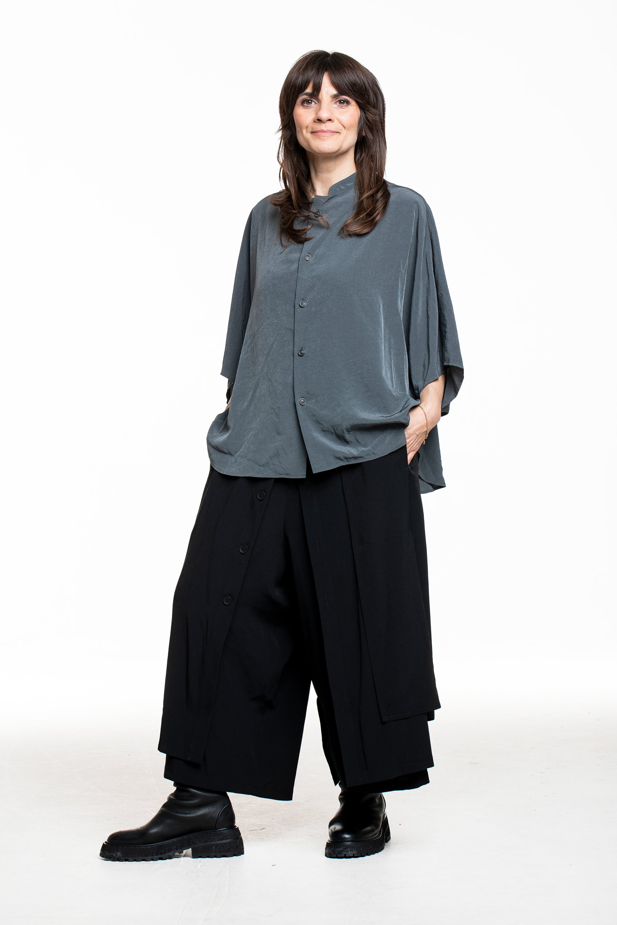 Wide-cut shirt by Y's Yohji Yamamoto, which translates the typical Japanese avant-garde into a casual silhouette. The softly flowing, slightly shiny fabric falls loosely over the shoulders, while the stand-up collar, full-length button placket and mid-length, wide-cut sleeves create a clean, minimalist line. Worn on its own or open over tops, this style is a versatile key piece - available in petrol and also in black.