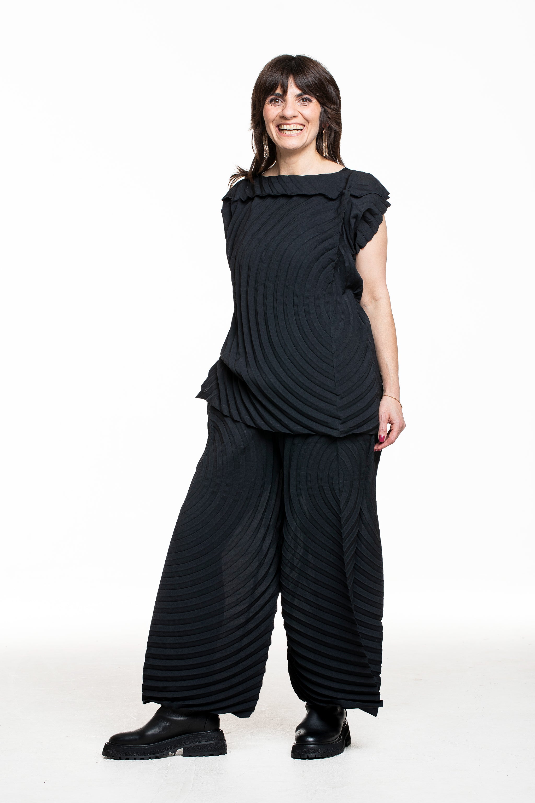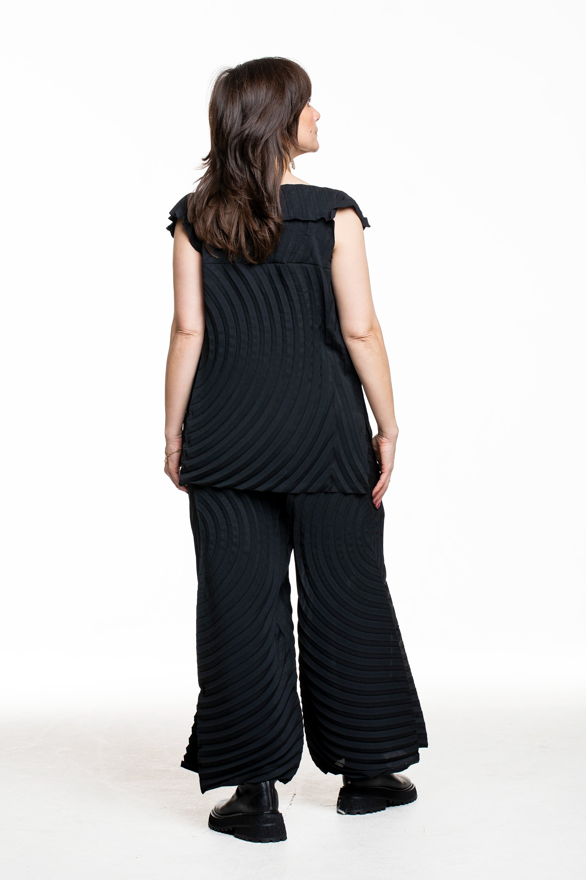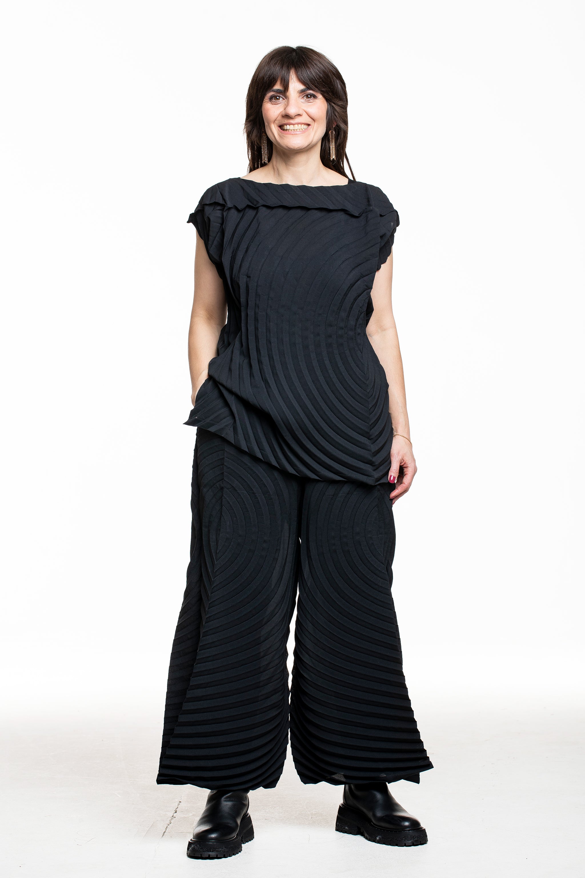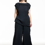 Issey Miyake zeigt mit dieser weit schwingenden Faltenhose, wie bequem avantgardistische Mode sein kann. Die charakteristische Kreisstruktur bringt Bewegung in jeden Schritt und spielt mit Licht und Schatten. Durch den elastischen Bund sitzt die Hose entspannt und ist zugleich city‑ und reisetauglich – solo oder im kompletten Set mit Top und Rock.