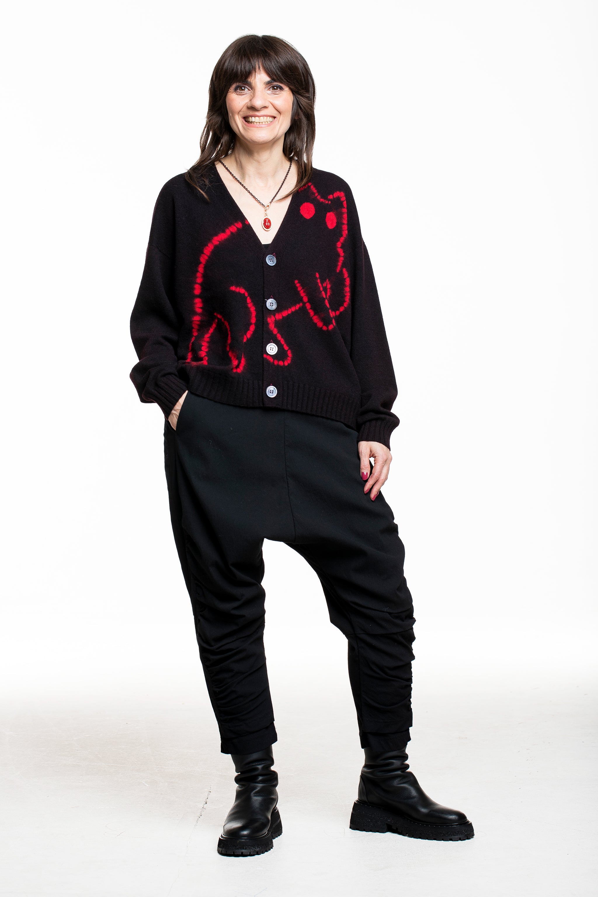 Kult‑Cardigan von Suzusan mit großem „Cat“‑Motiv in kräftigem Rot. Der nahtlose Kaschmirstrick fällt weich, die lockere Form lässt sich perfekt zu Hosen und Kleidern kombinieren.
