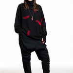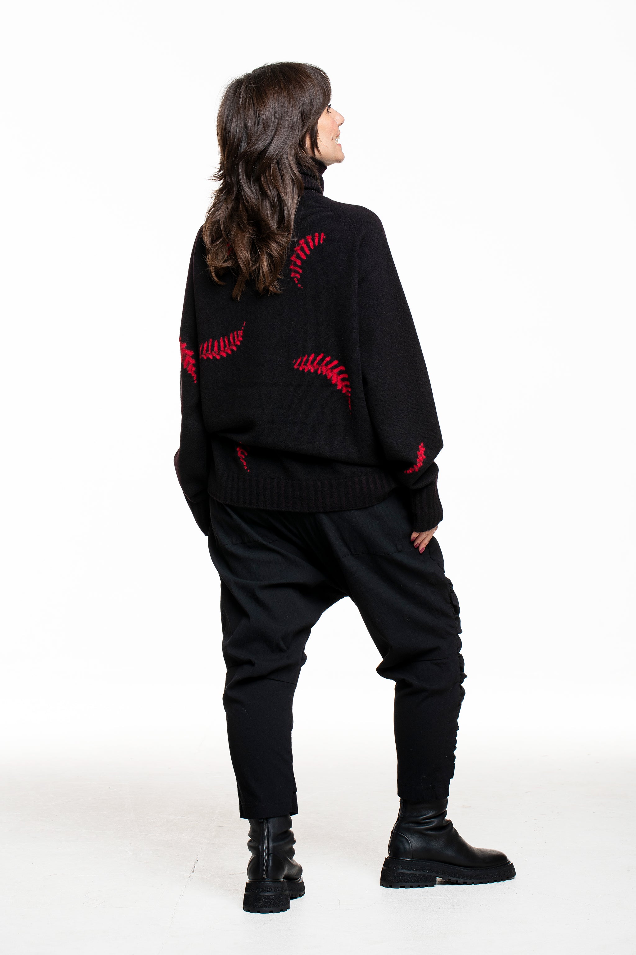 Skulpturaler Kaschmir‑Rollkragenpullover von Suzusan mit ikonischem „Feather“‑Shibori in leuchtendem Rot auf Schwarz. Die Raglanärmel und das nahtlose Strickbild sorgen für eine besonders weiche, fließende Silhouette.