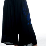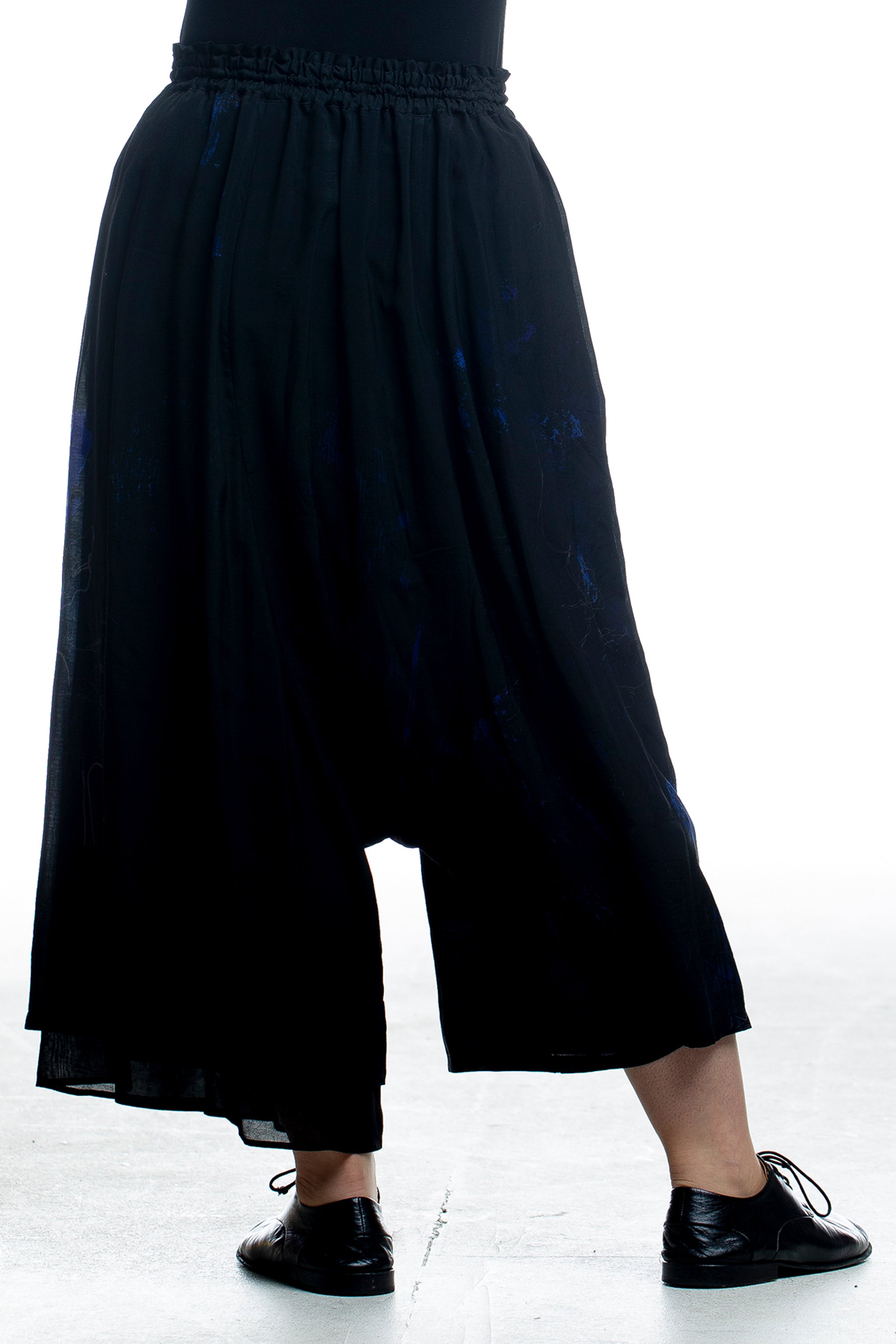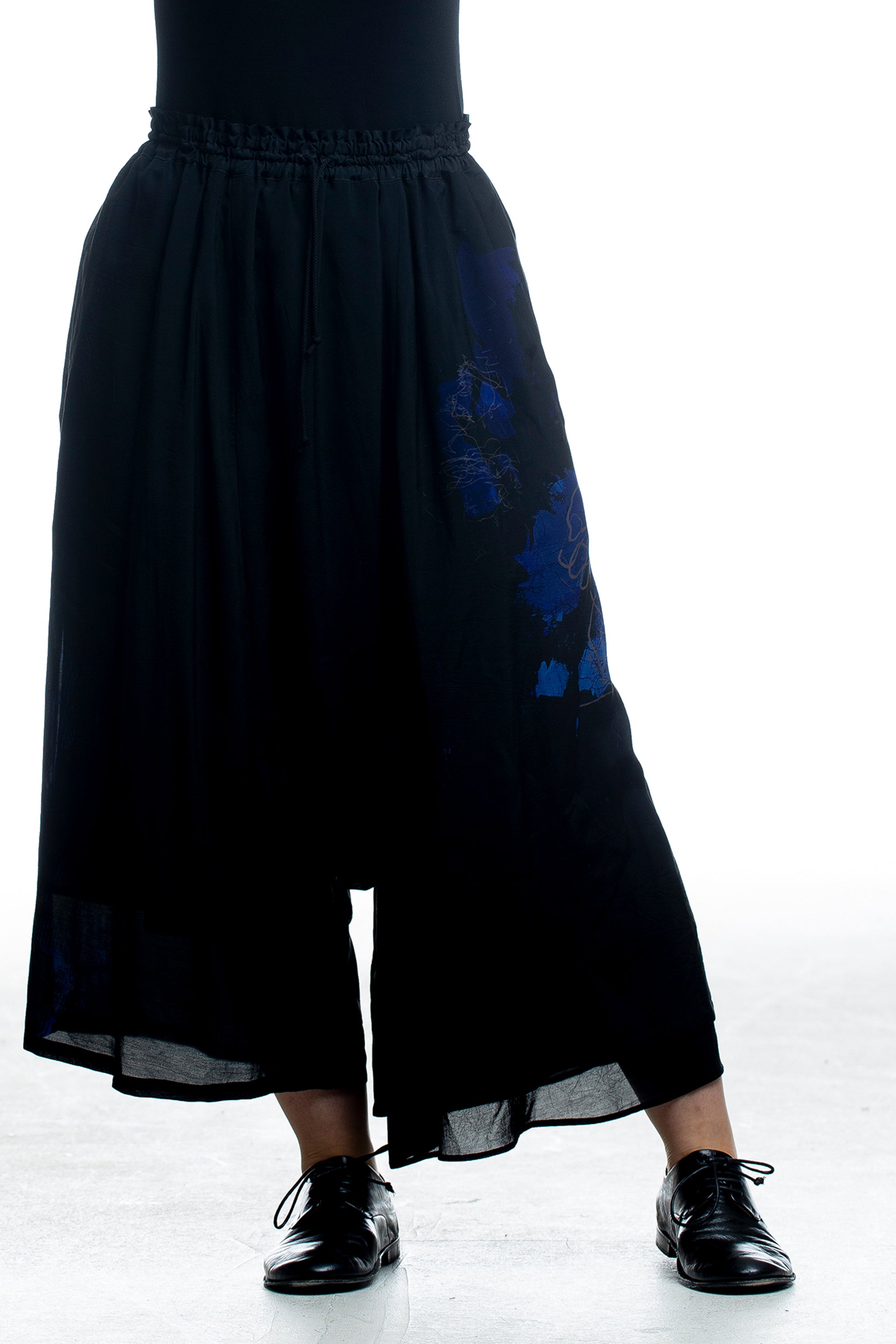 Schwarze Damenhose von Y’s Yohji Yamamoto  in weiter Silhouette mit elastischem Bund und künstlerischem Seitendruck in Blau – gefertigt aus luxuriösem Cupro.