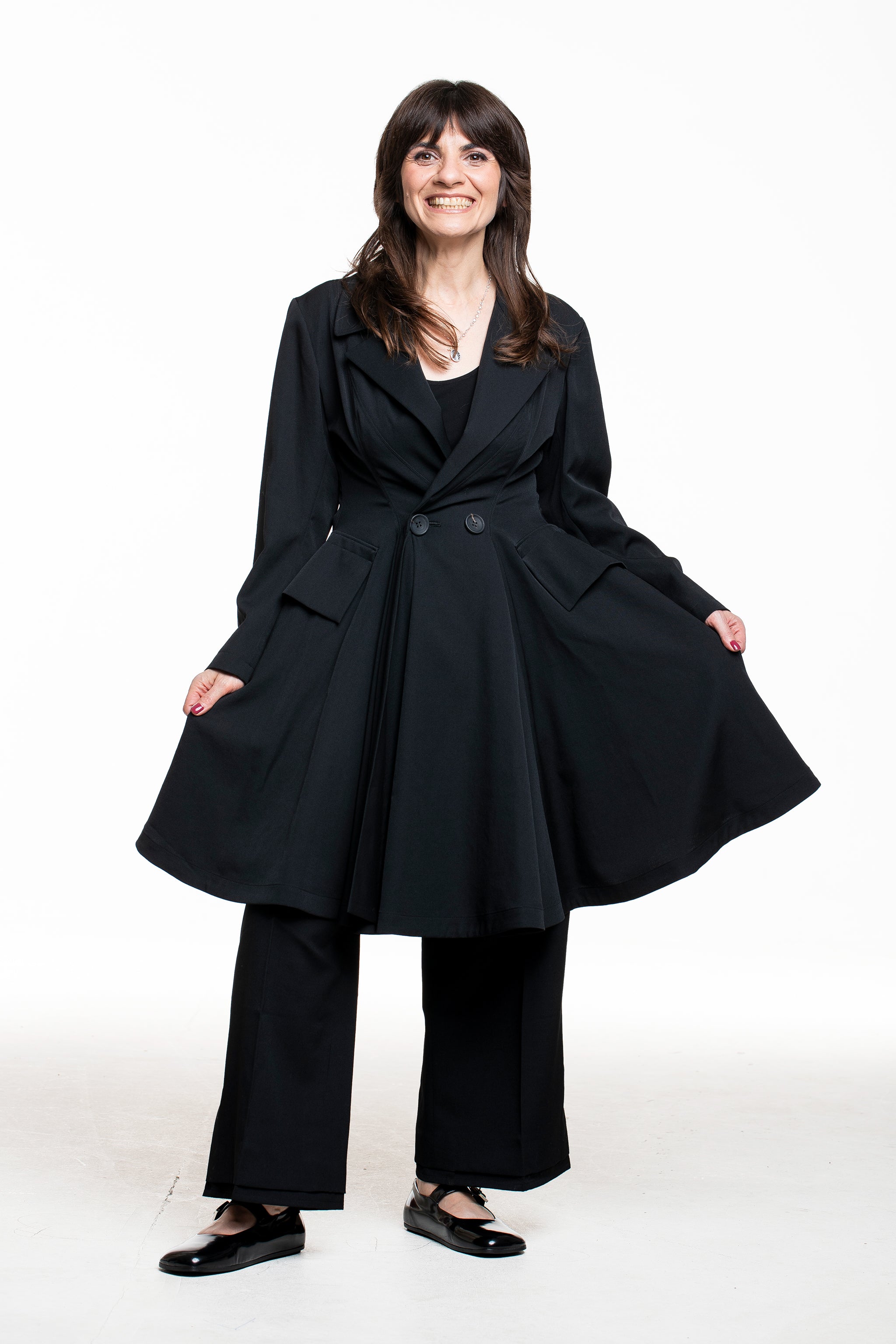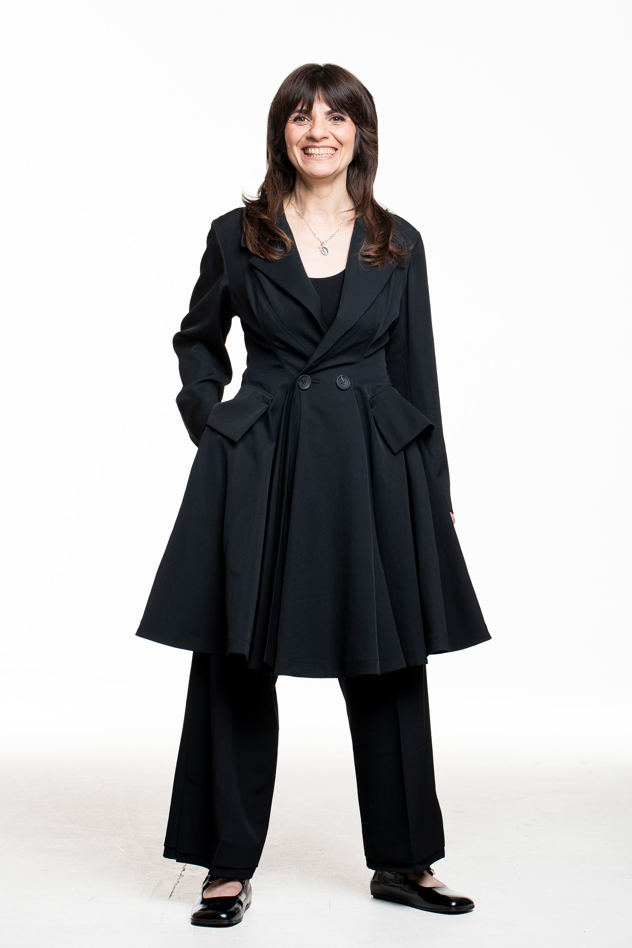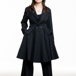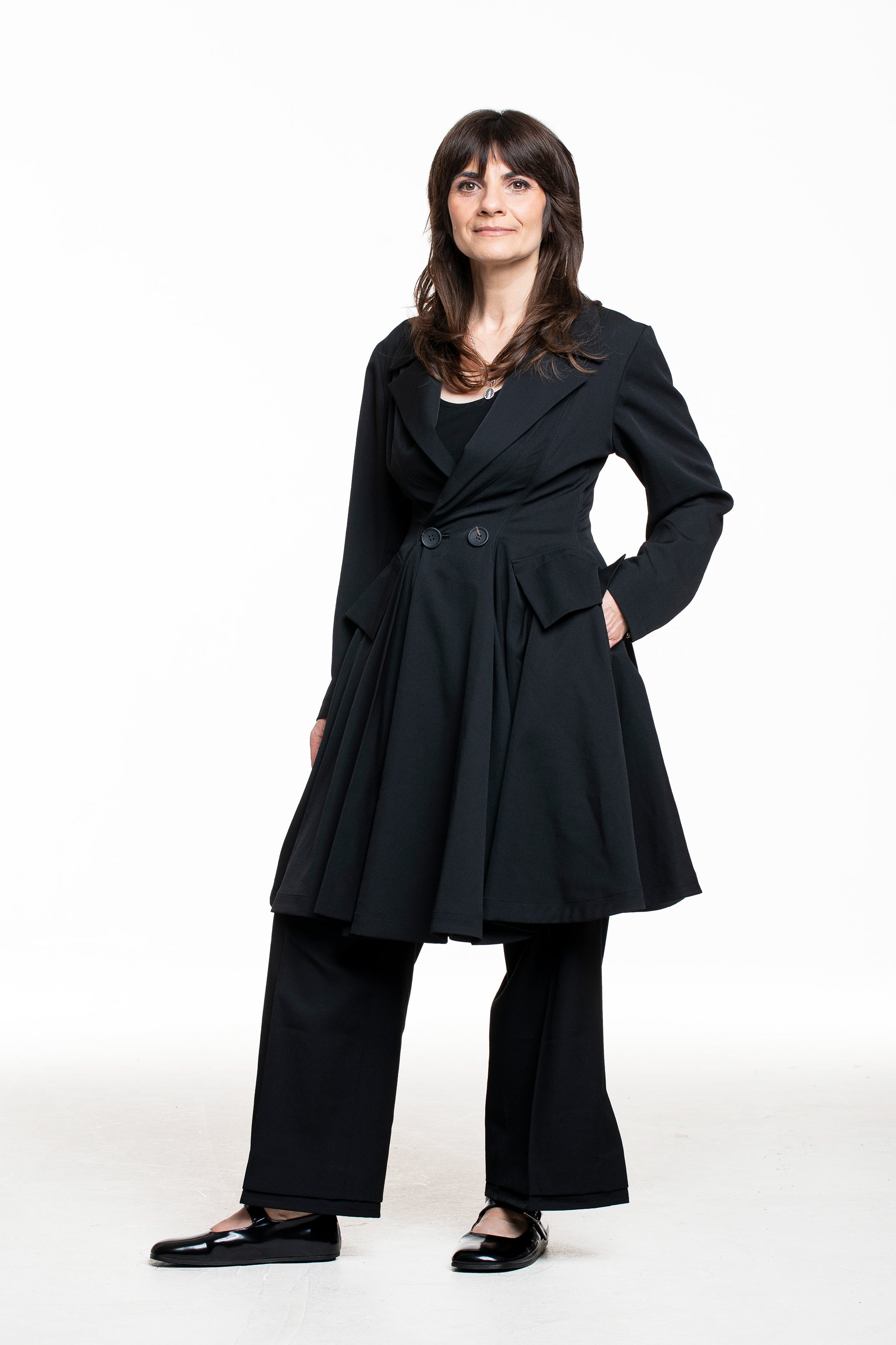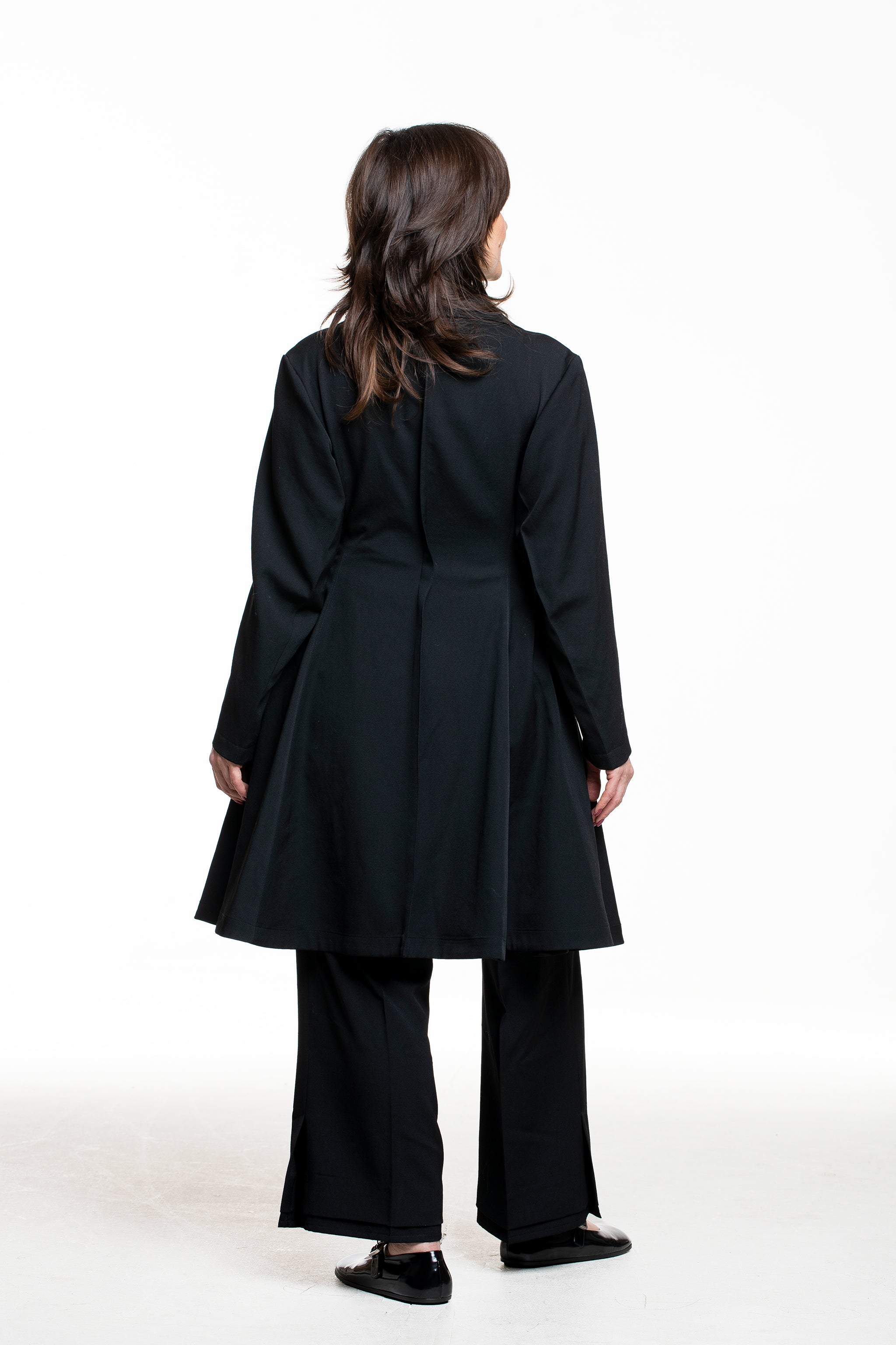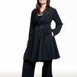 Diese Jacke fängt die Essenz von Yohji Yamamotos Schneiderkunst ein: eine klare, gezeichnete Taille, die in eine weit schwingende A‑Linie übergeht. Der Reverskragen und zwei Knöpfe auf Taillenhöhe formen eine leichte Wickel‑Optik, während in der Seitennaht liegende Taschen die Silhouette unaufgeregt funktional machen.