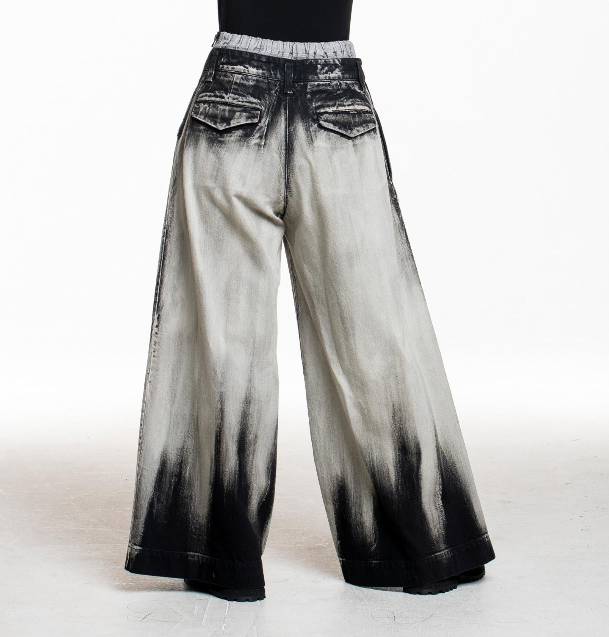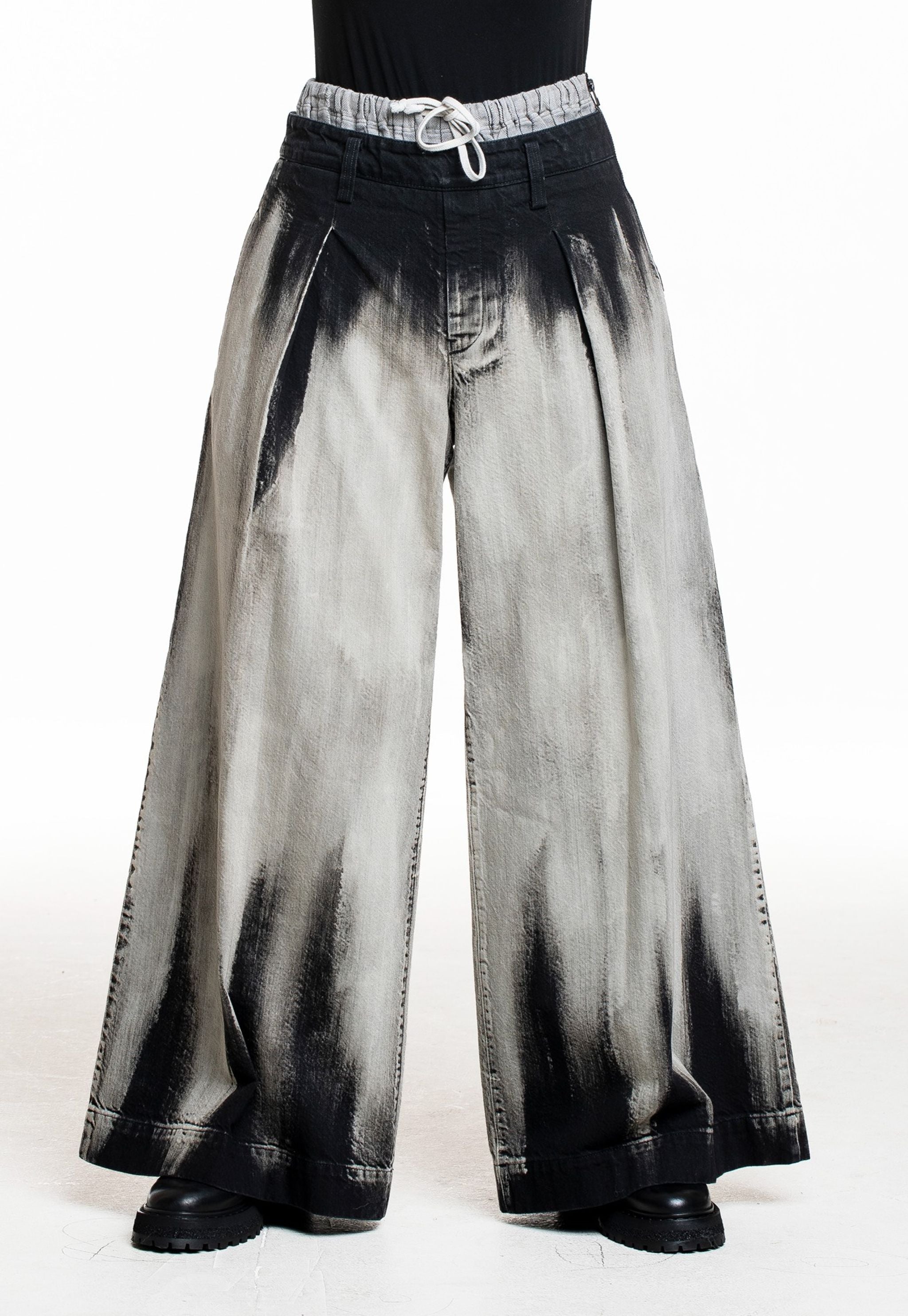 Ein Entwurf von Yohji Yamamoto mit weiter, bewegter Silhouette und feiner Faltenlegung am Bund. Der weich fallende Baumwollstoff zeichnet einen Tonverlauf in dunklen Nuancen; die Proportion wirkt leicht und lässt sich vom cleanen Styling bis zum ausdrucksstarken Look vielseitig kombinieren.