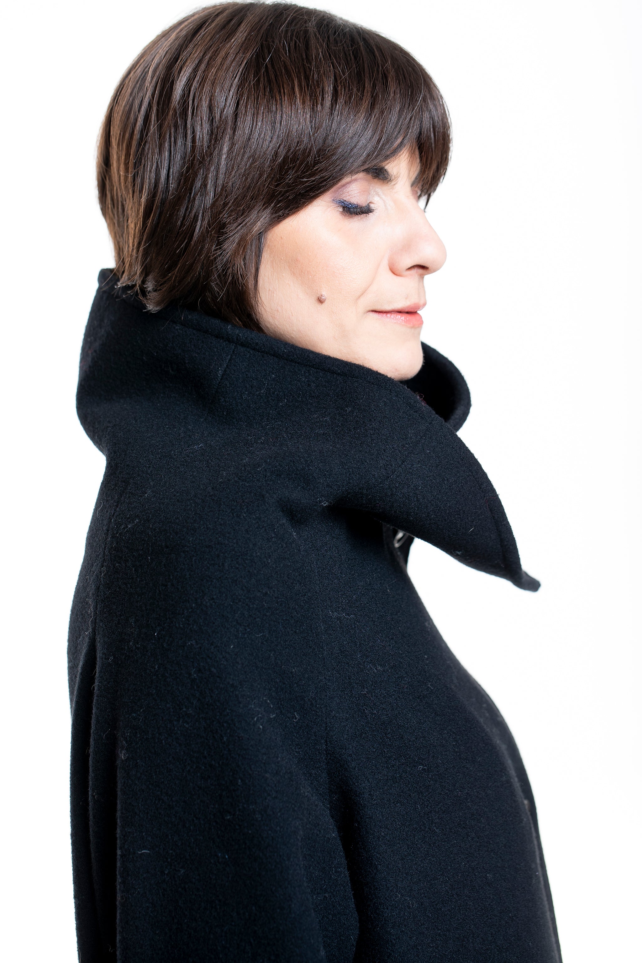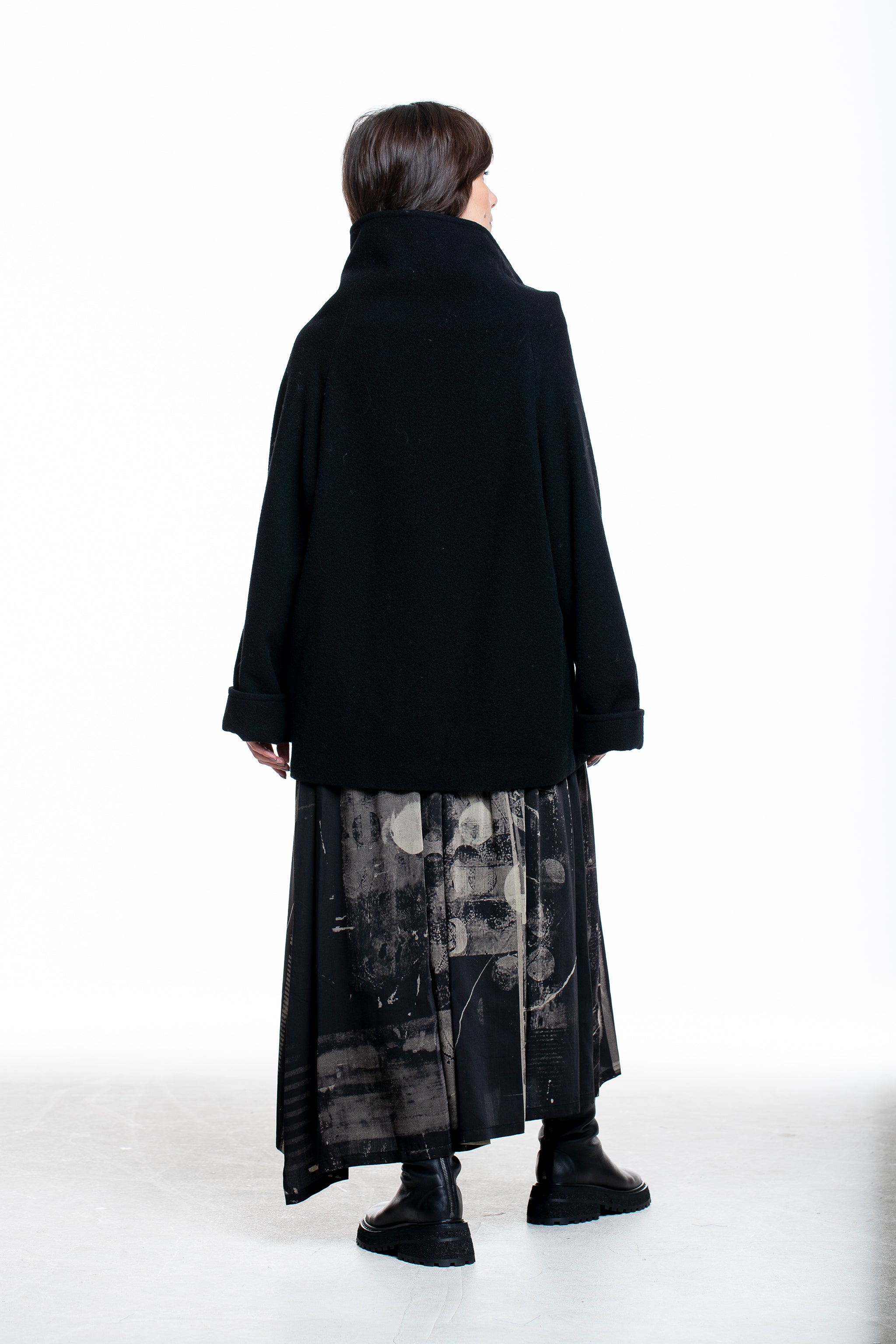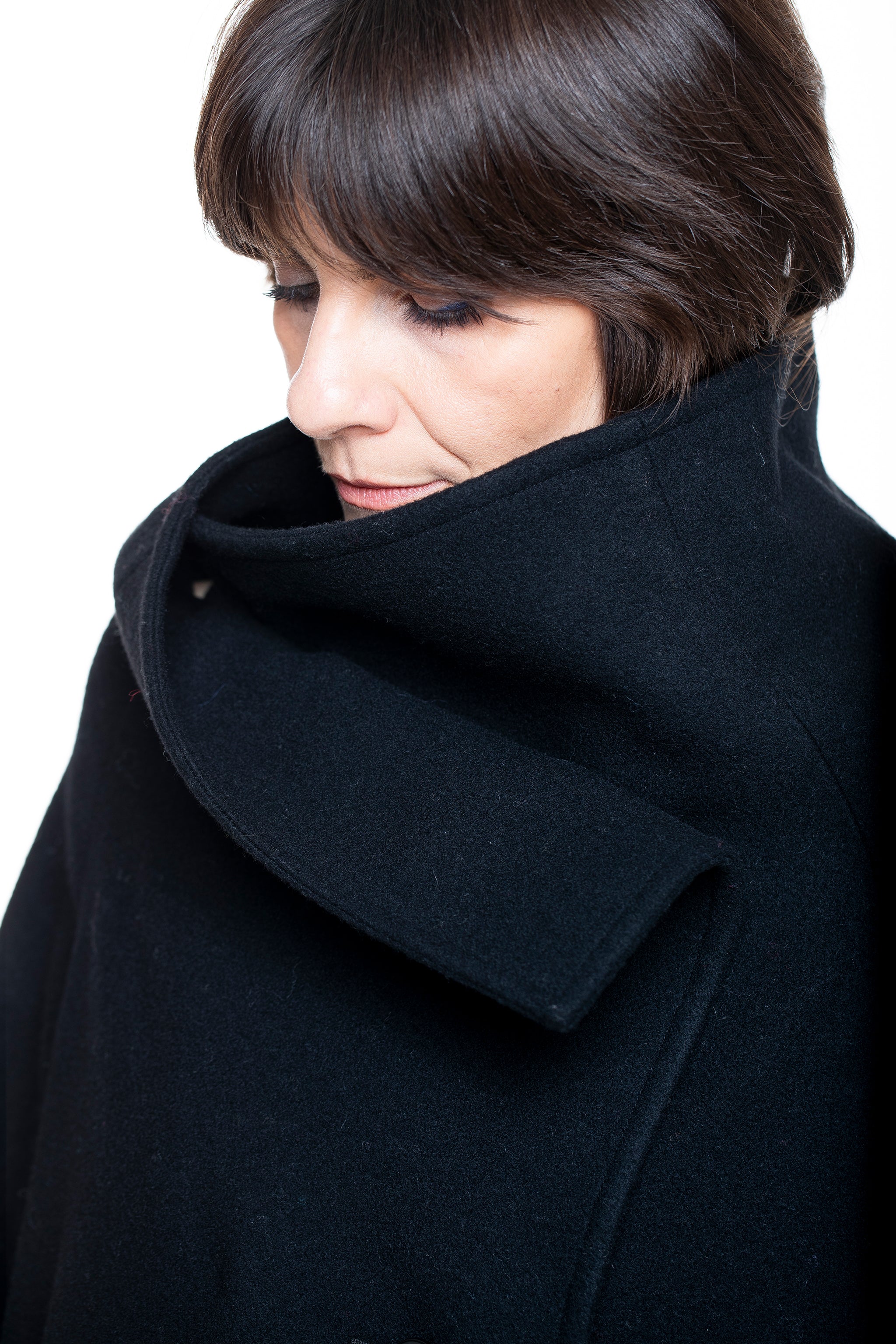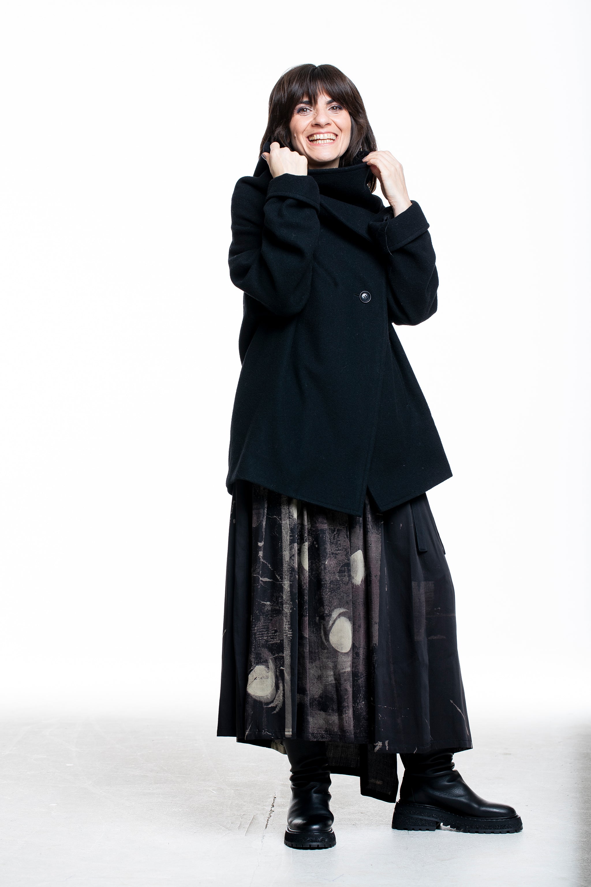 Puristische Linien, starke Silhouette: Dieses gefütterte Modell von Yohji Yamamoto arbeitet mit einem hoch schließenden, asymmetrisch drapierten Abschluss, der wie ein integrierter Schal wirkt. Die Front überlappt leicht und schließt über einen einzelnen Knopf – clean, architektonisch und ideal für Layering.