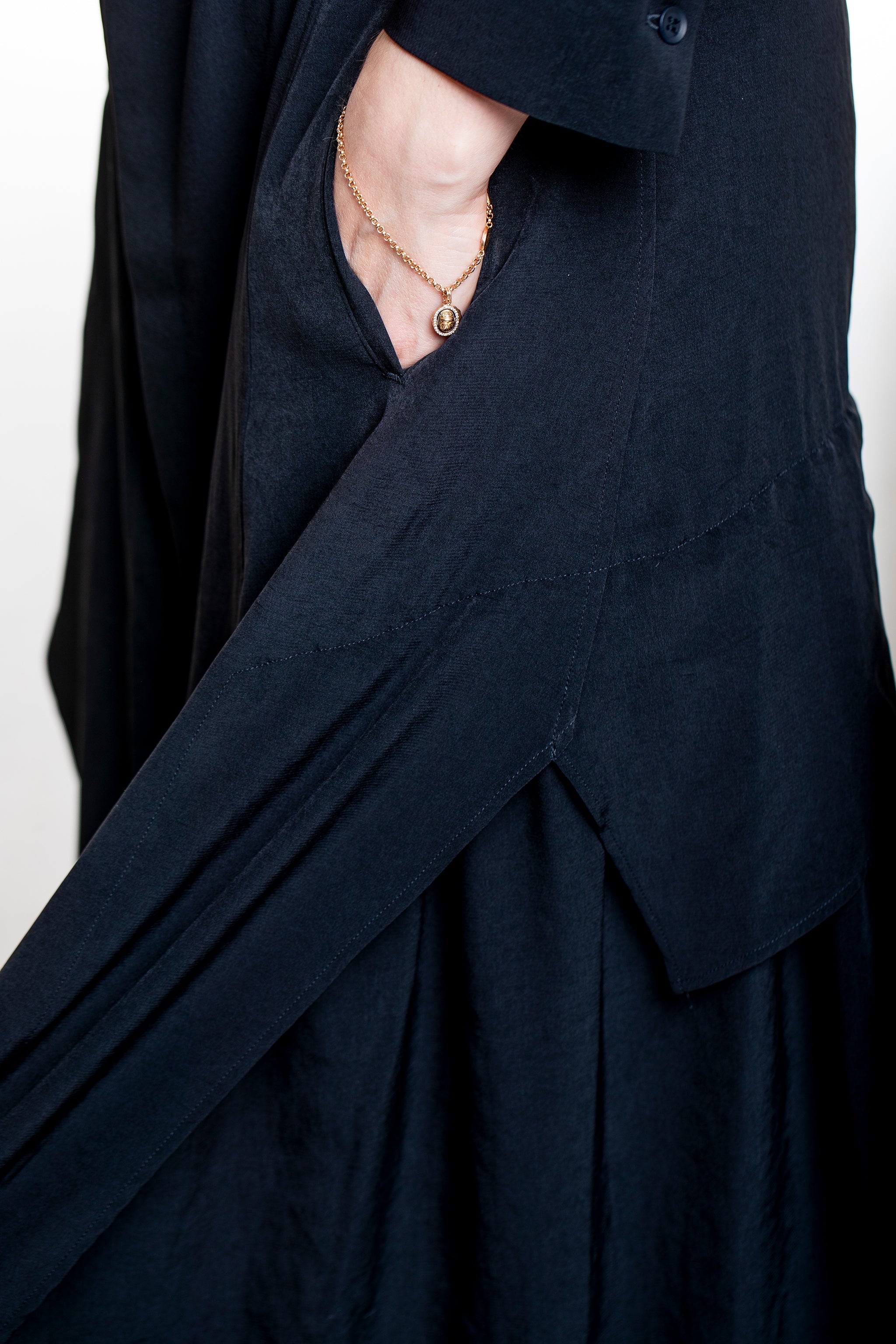 Yohji Yamamoto reduziert die Hemd-Form auf das Wesentliche und setzt den Fokus auf Fall und Schnitt. Das Designerkleid trägt sich leicht und fließend, wirkt dabei aber durch den klassischen Hemdkragen und die verdeckte Knopfleiste sehr klar. Ein asymmetrischer Überwurf im Saumbereich bringt Bewegung in die Silhouette und macht das Piece ideal für Layering über Röcken und Hosen – minimalistisch, präzise und typisch Yamamoto.